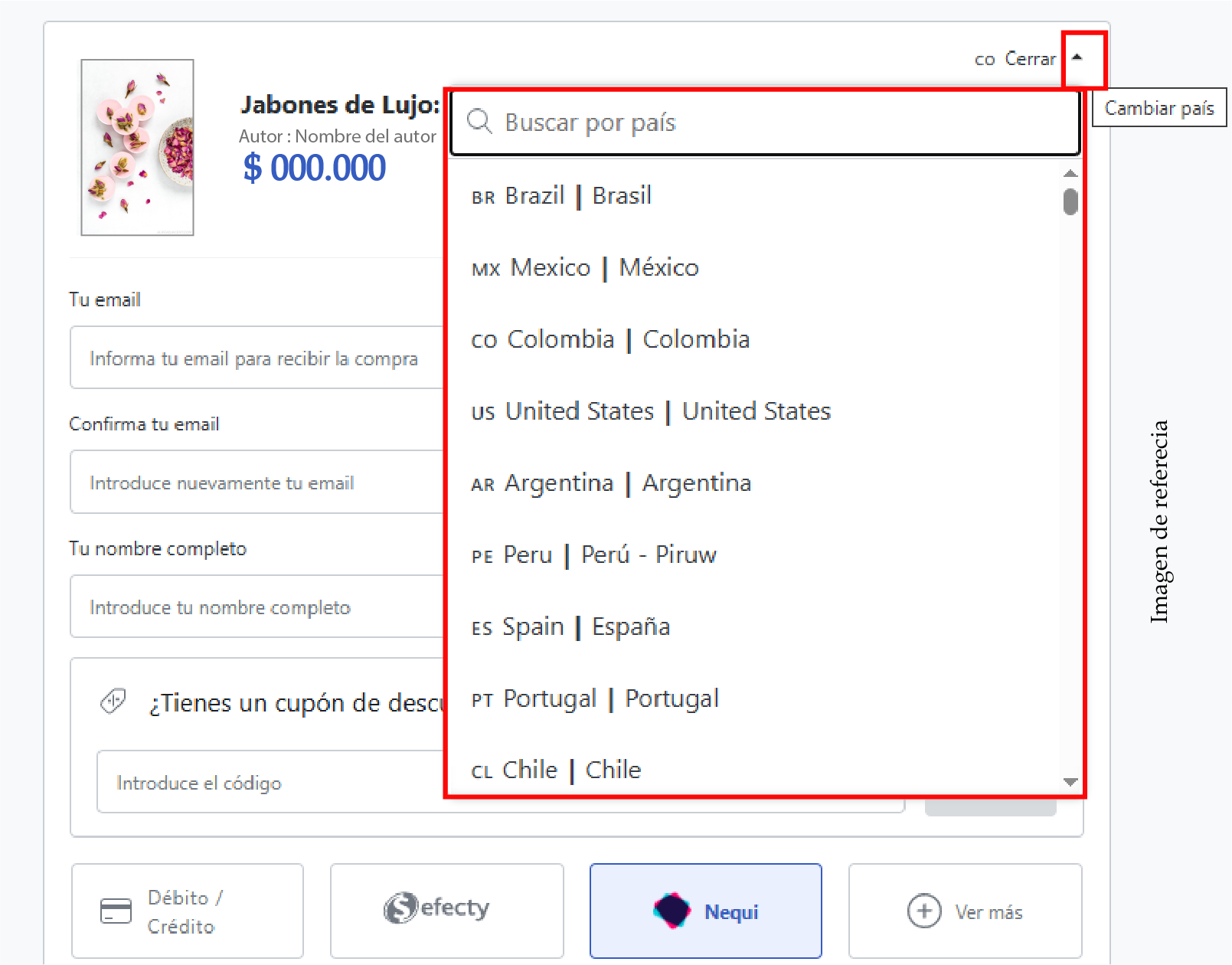 En la plataforma de pagos haz clic en la flecha de la parte superior donde dice “Cambiar país”. Luego selecciona el país donde te encuentras. Así de simple podrás ver el precio en tu moneda local y continuar con tu compra sin complicaciones. 🛒